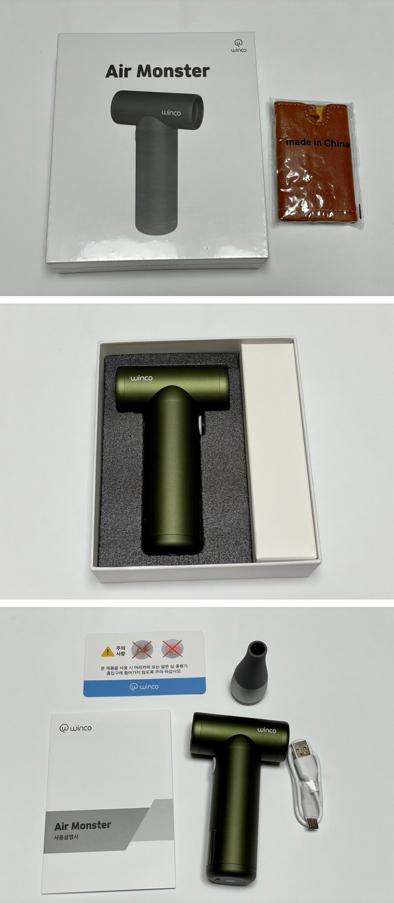 구성품은 충전 케이블과 노즐, 에어건 본체, 사용설명서와 주의사항 카드가 들어있네요.