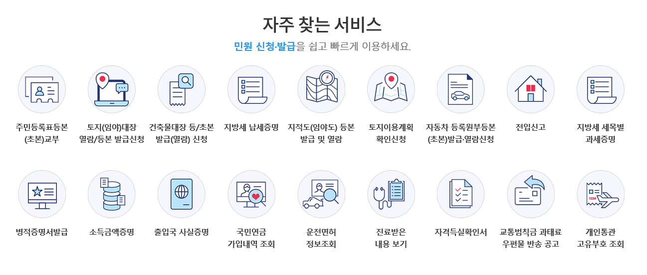 그러면 아래와 같은 메인 화면이 뜨는데……자주 있는 서비스 중 첫 번째 화살표로 표시한 부분이 주민등록등본(초본) 발급입니다.