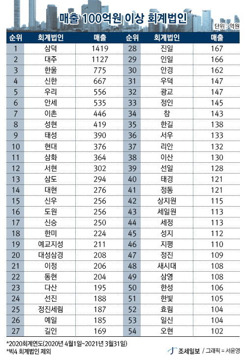 삼일 회계 법인의 매출액이 76만 3313백만원, 즉 약 7,633억원 정도로 가장 높다. 그 뒤 삼정 회계 법인의 매출액이 6202억원, 한영 회계 법인의 매출액이 4,035억원, 안진 회계 법인 매출액이 3,746억원 순이다. 언급한 4곳이 이른바 빅 4로 전체 회계 법인 매출액의 약 50%를 차지한다. 빅 44개사의 매출 합계가 약 216억원에 이른다. 즉 2조 1,616억원. 한국 전체의 회계 시장 규모도 짐작할 것.로컬 회계 법인으로는, 삼덕 회계 법인, 대주주 회계 법인, 하늘 회계 법인, 신한 회계 법인, 우리 회계 법인의 순. 업계에 종사하고 있다면 이름을 들은 적 있는 회계 법인이다. 빅 4이후에 끊어 보면 6위까지 주인 회계 법인에서 다시 끊을 수 있고 그 후에는 매출액 순위가 잘게 이어진다.빅 4과 로컬 회계 법인의 매출액 비중, 영업 손익, 구성원 수 등 기회가 있으면 다시 흥미로운 통계를 기록하도록 한다.